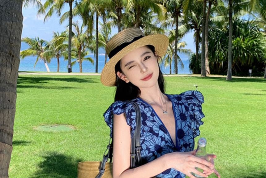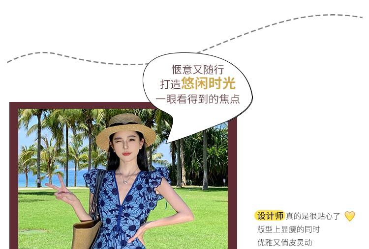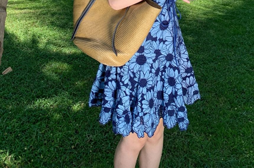Cap Sleeve V-Neck Floral Embroidered Drawstring Mini A-Line Dress