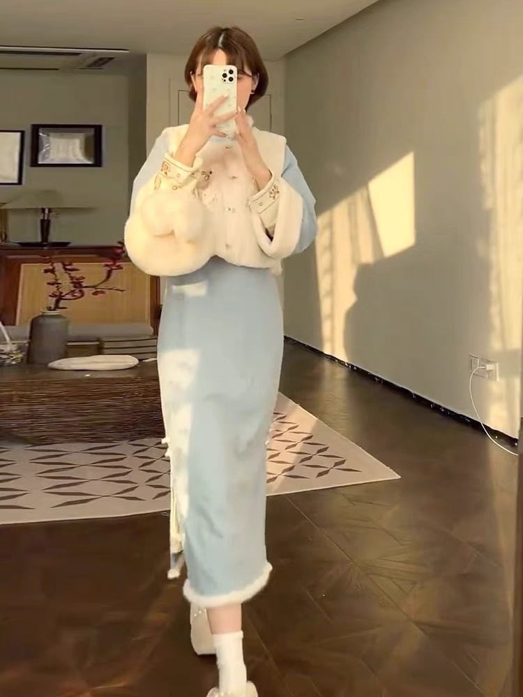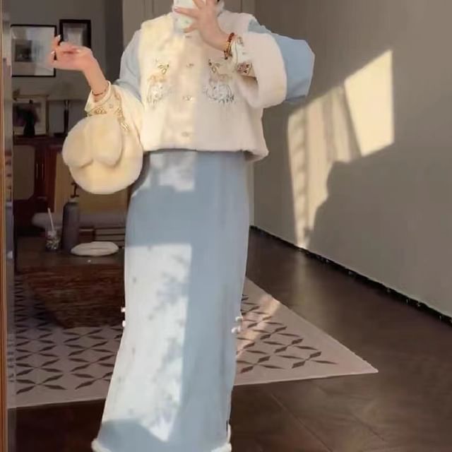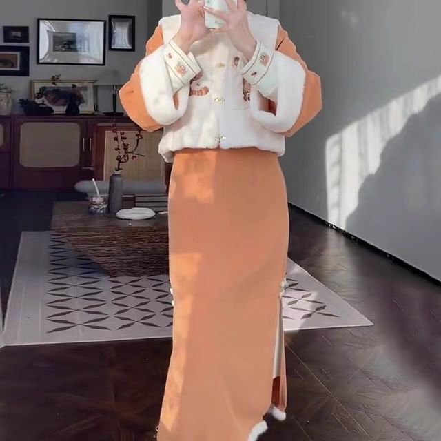 Cartoon Embroidered Fleece Button Vest / Long-Sleeve Midi Qipao / Set