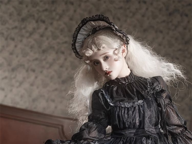 Lolita Cinched Sleeve Stand Collar Plain Bow Ruffle Blouse / Sleeveless Square Neck Floral Print Bow Mesh A-Line Dress / Set