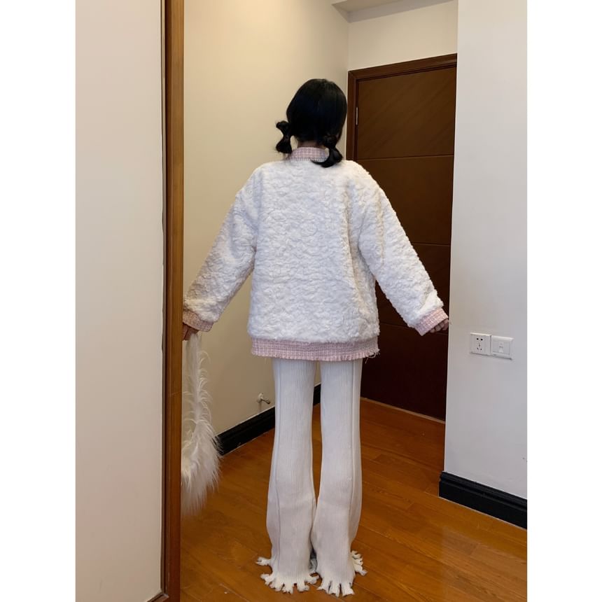 Collar Applique Fringed Tweed Panel Fleece Button Jacket