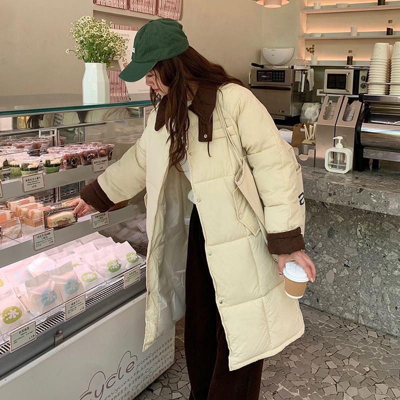 Collared Two Tone Panel Corduroy Midi Zip Puffer Coat