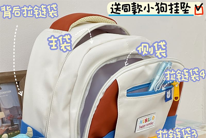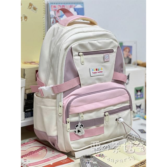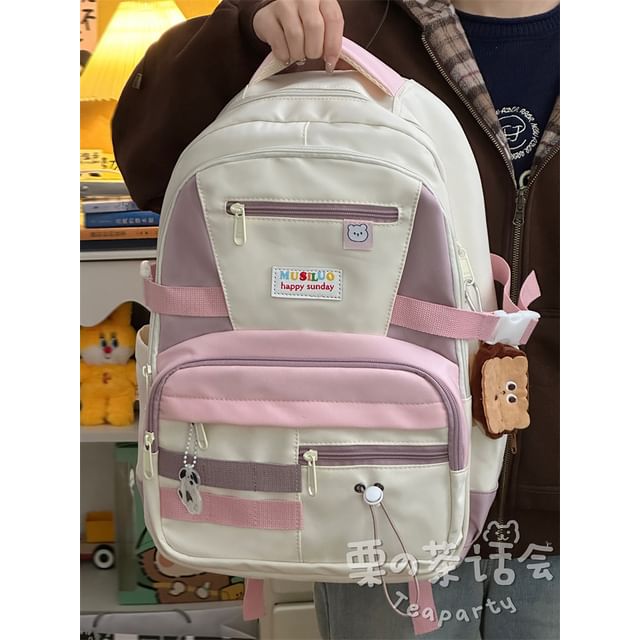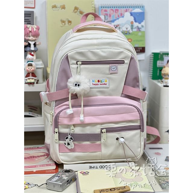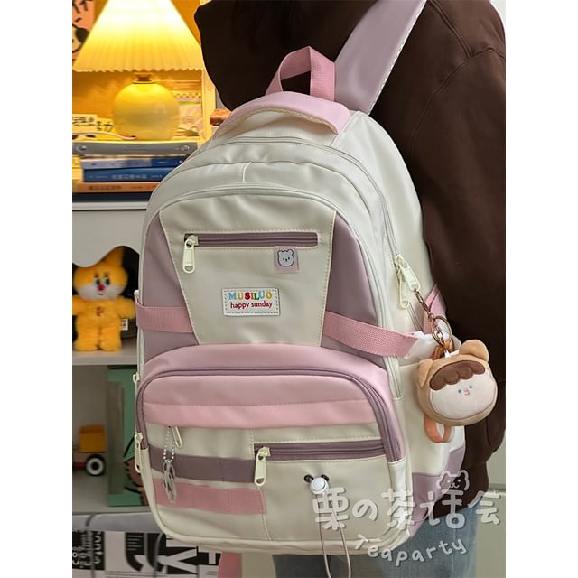 Color Block Multi-Pocket Backpack / Coin Purse / Bag Charm / Set