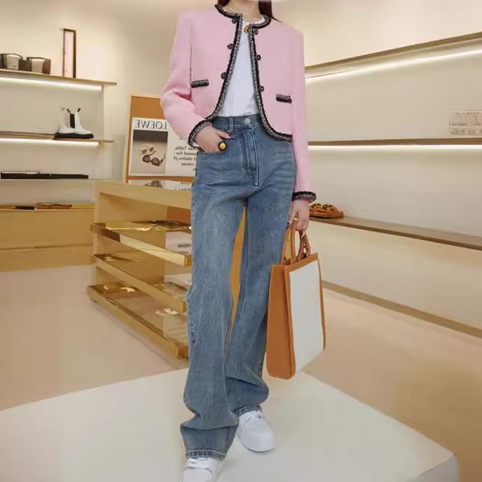 Crew Neck Contrast Trim Button-Up Tweed Crop Jacket