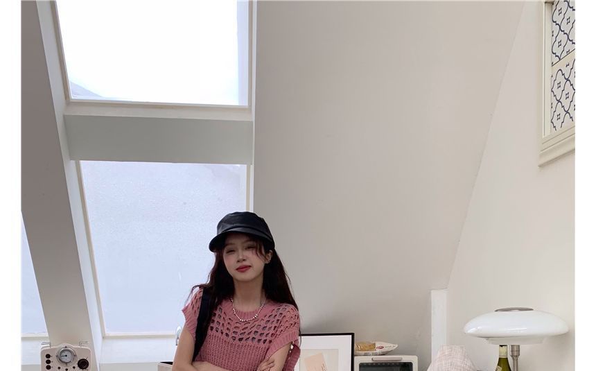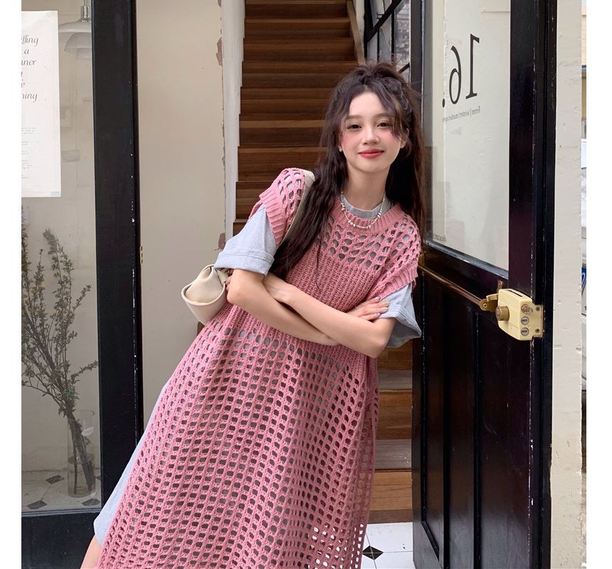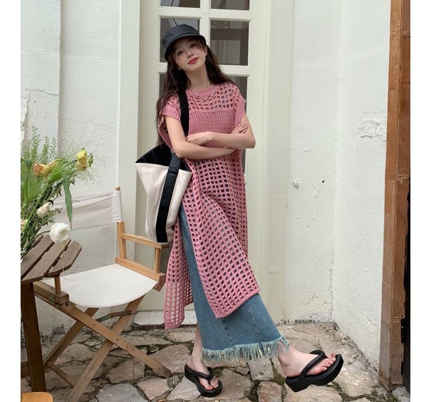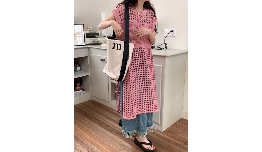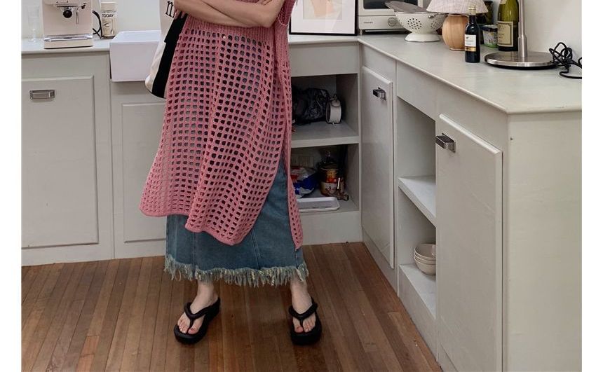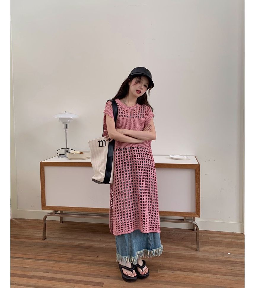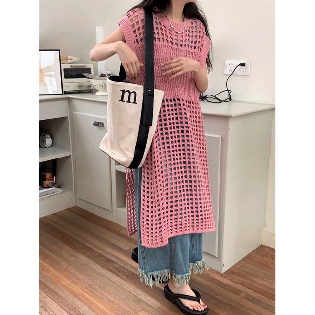 Crew Neck Plain Slit Crochet Long Sweater Vest