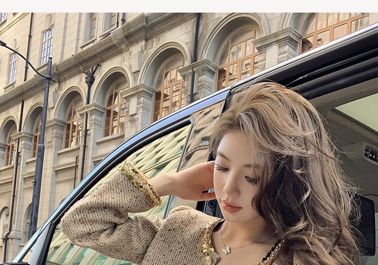 Crew Neck Sequin Trim Button-Up Tweed Crop Jacket / High Rise Mini A-Line Skirt