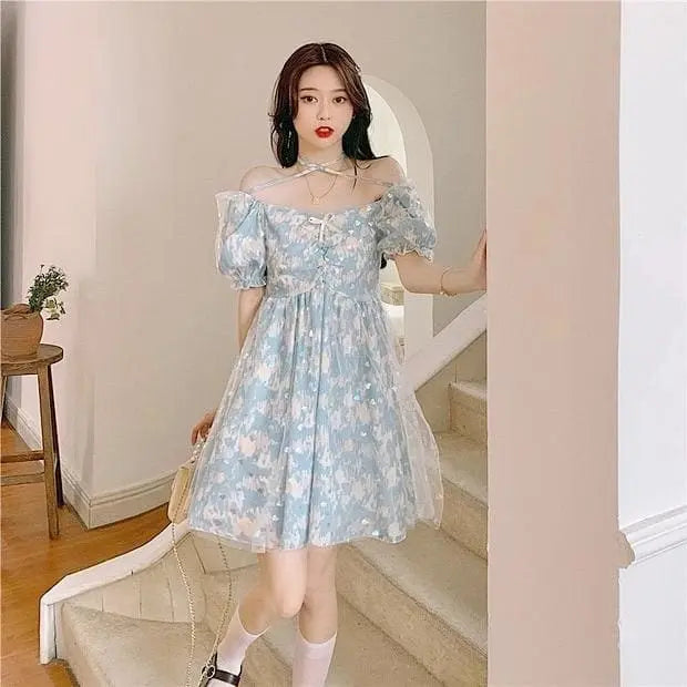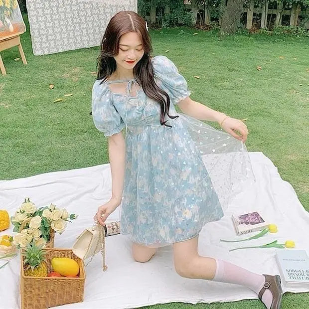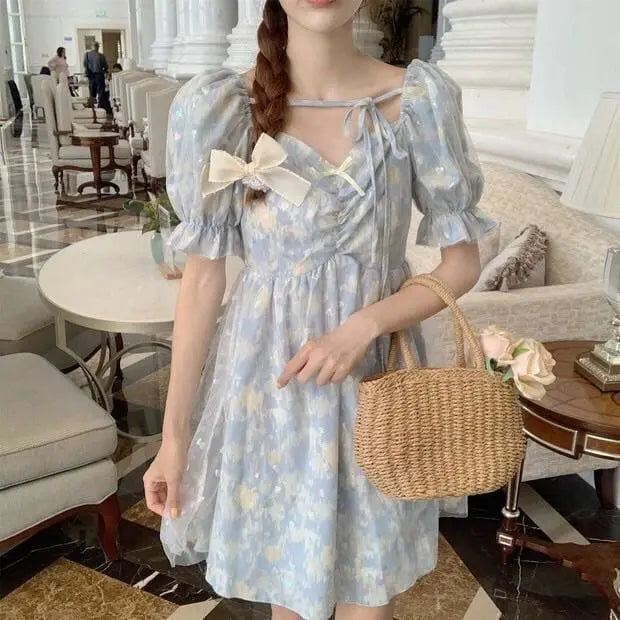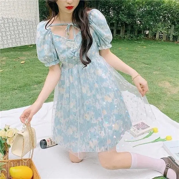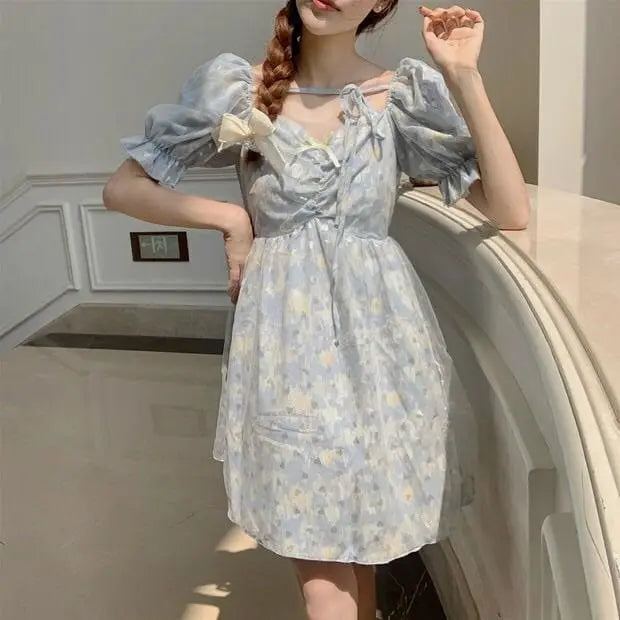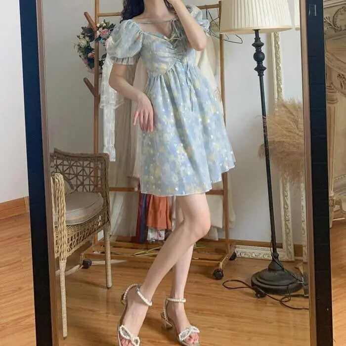 Soft Girl Aesthetic Holographic babydoll Fairy Dress with short Puff Sleeves and empire waist