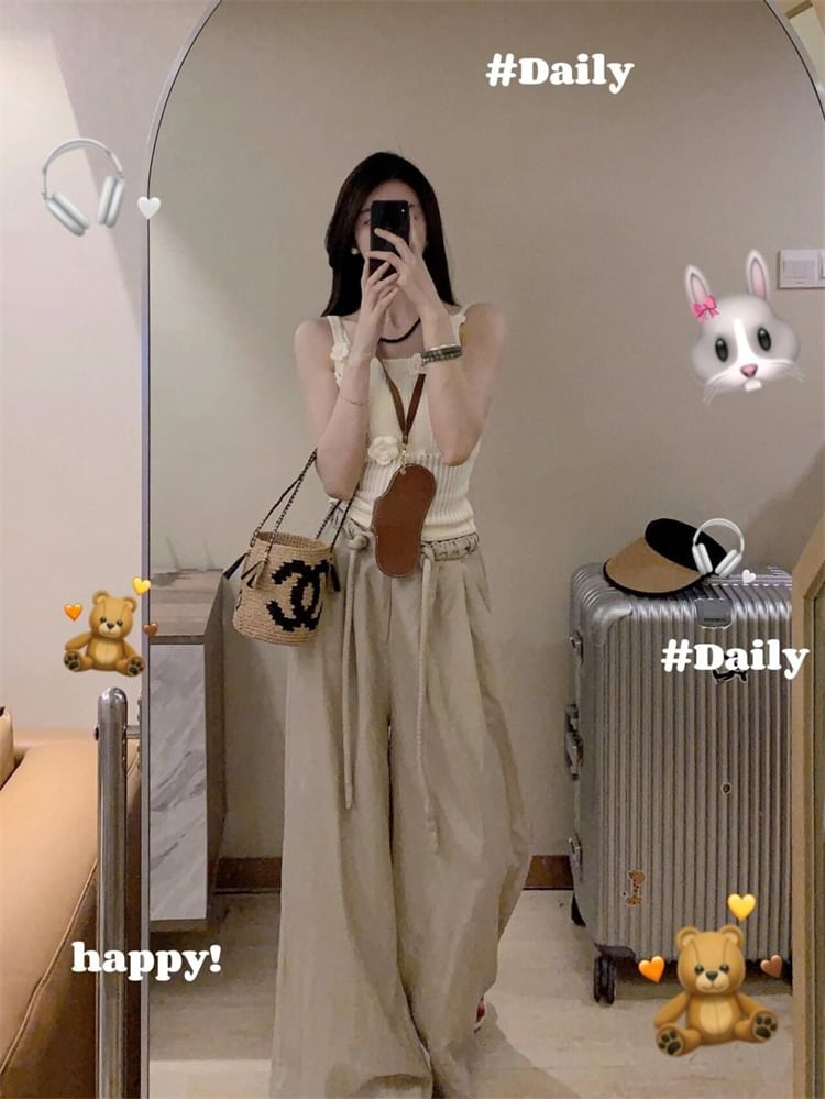Drawstring Waist Plain Wide Leg Pants
