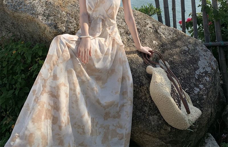 Halter Floral Ruffle Trim Open Back Maxi A-Line Dress