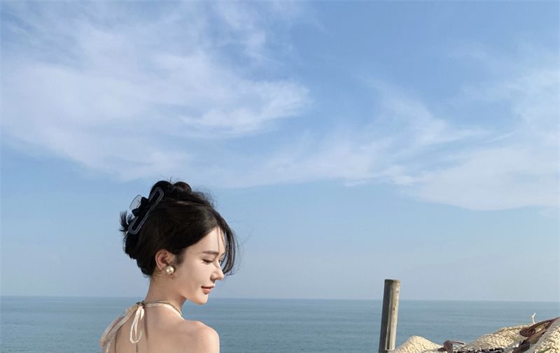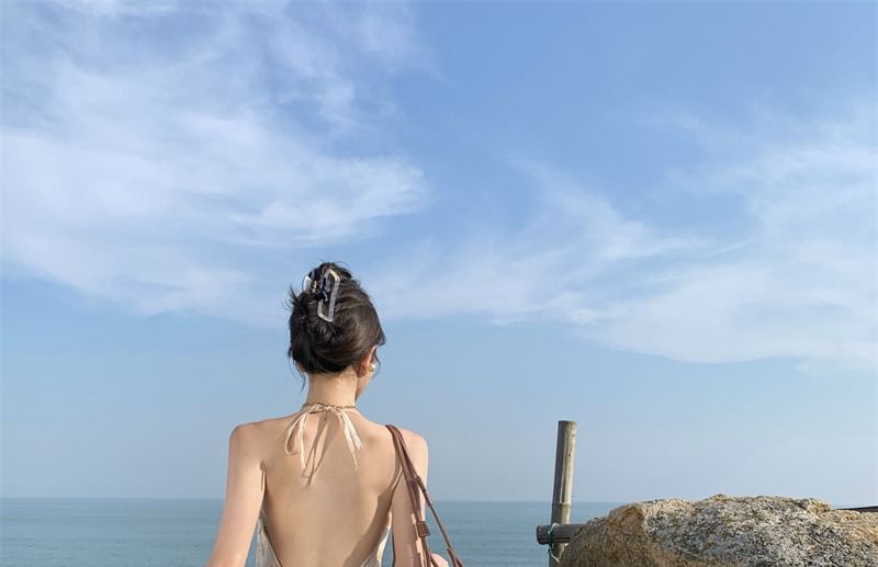 Dress Open A-Line Back Maxi Trim Floral Halter Ruffle