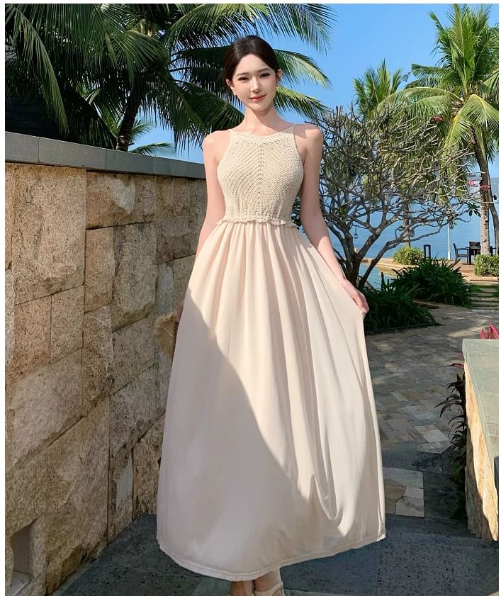 Dress Spaghetti Maxi A-Line Strap Panel Plain Knit