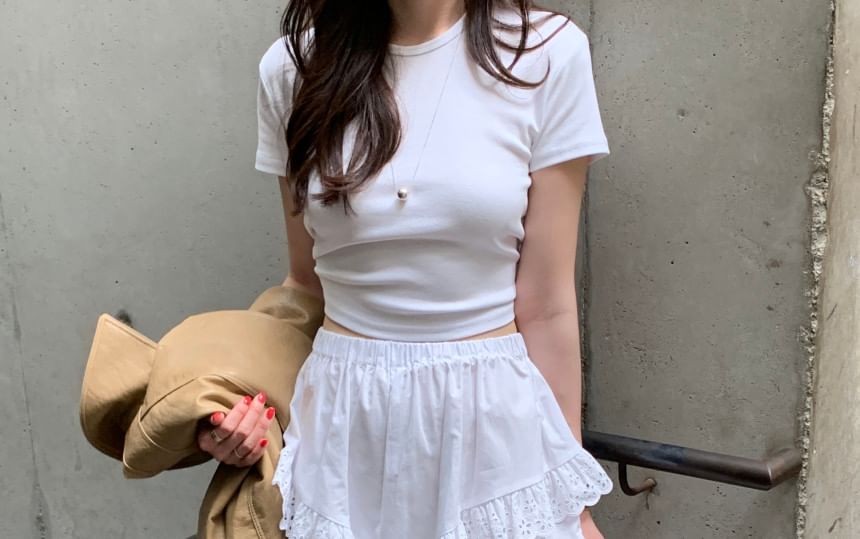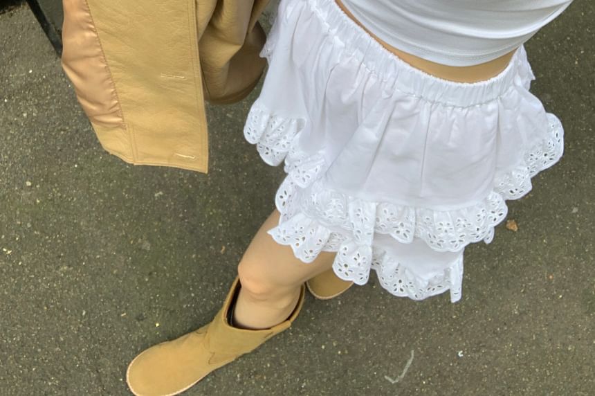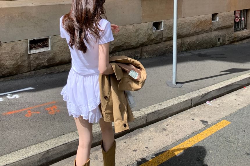 Elastic Waist Plain Asymmetrical Lace Trim Mini A-Line Skirt