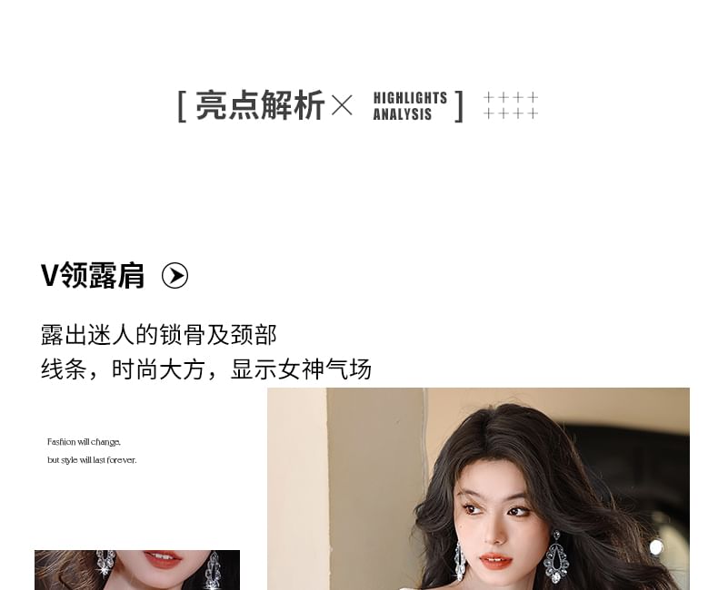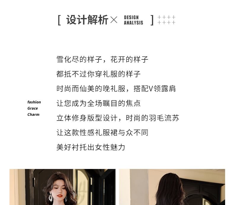 Elbow-Sleeve Cold Shoulder V-Neck Fringed Mermaid Evening Gown