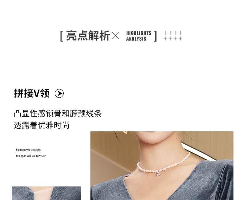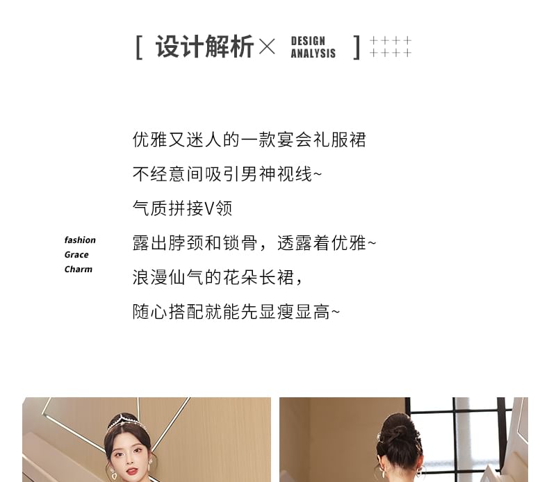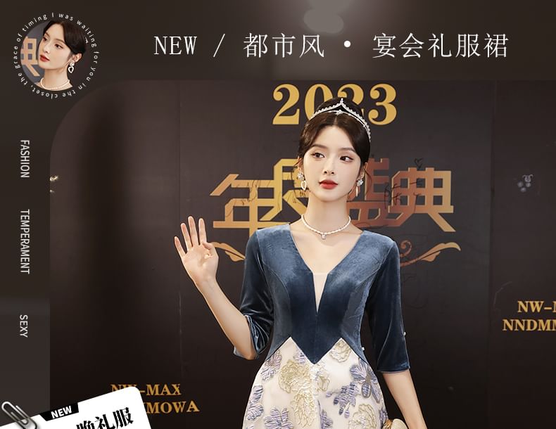 Elbow-Sleeve V-Neck Velvet Panel Floral Jacquard Mesh A-Line Evening Gown