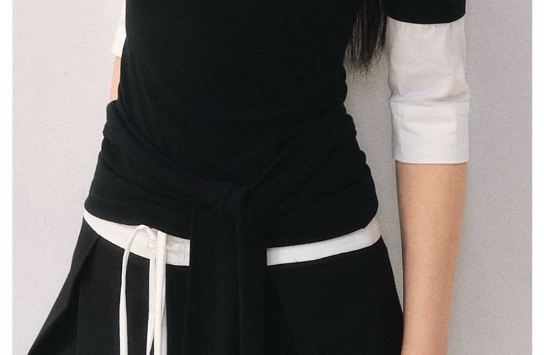 Elbow-Sleeve Collar Two Tone Mock Two-Piece T-Shirt