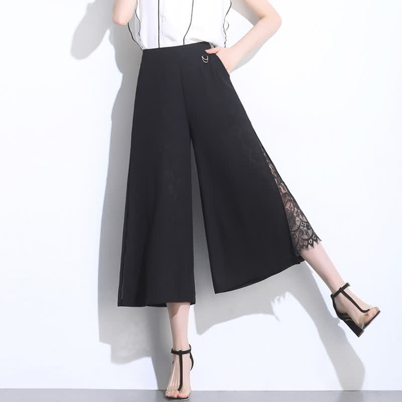 Embrace elegance wearing our Elegant Black Lace Stitching Wide Leg Pants. With its intricate lace detailing and wide leg design, these pants exude sophistication and style. Perfect for any occasion, these pants are sure to make a statement and elevate your outfit to the next level.
