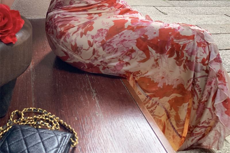 Floral Asymmetrical Ruffle Trim Slit Maxi Bodycon Tube Dress