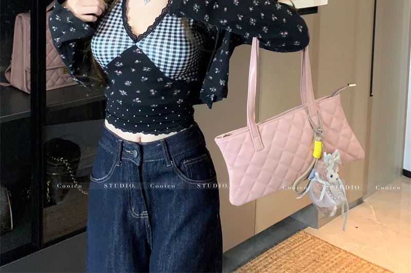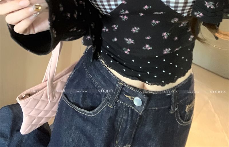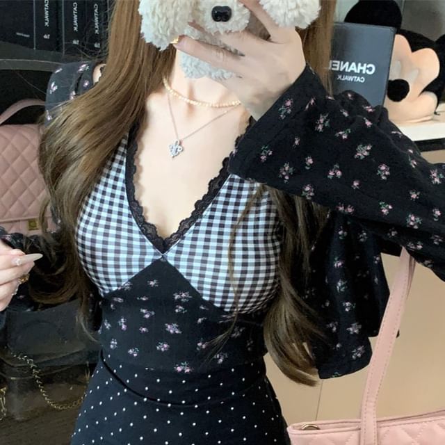 Plaid Panel Crop Cami Top / Floral Print Cardigan / Mini Dress