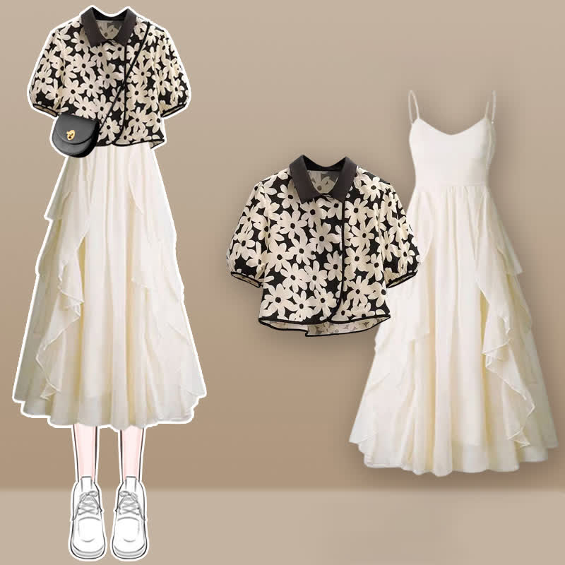 Floral Print T-Shirt Irregular Slip Dress Denim Pants Set