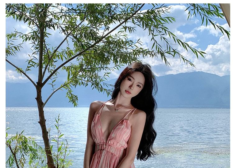 Floral Strap Dress Spaghetti Print Maxi V-Neck A-Line