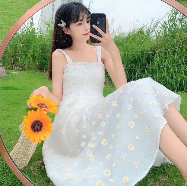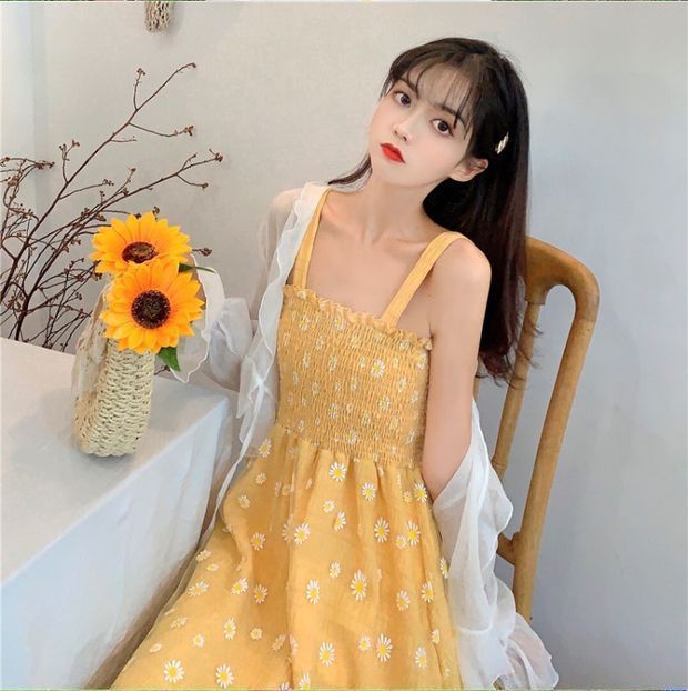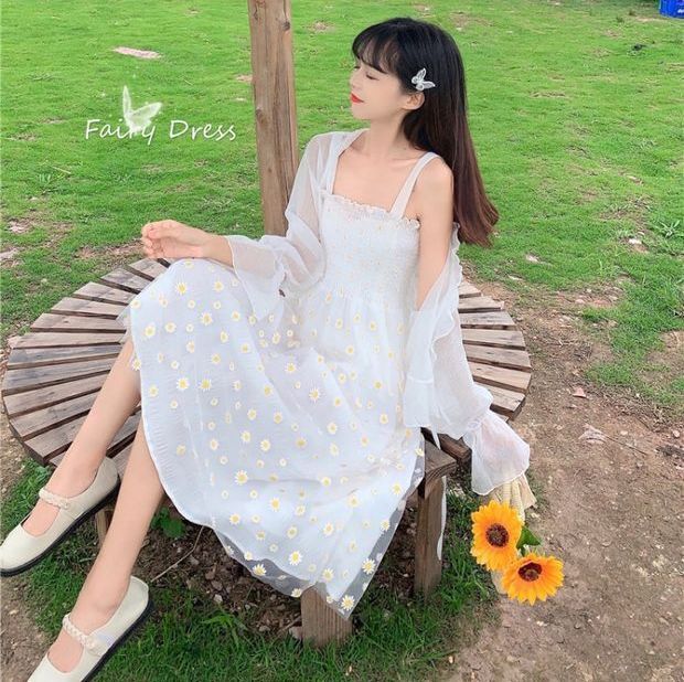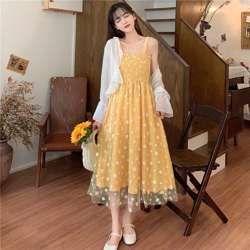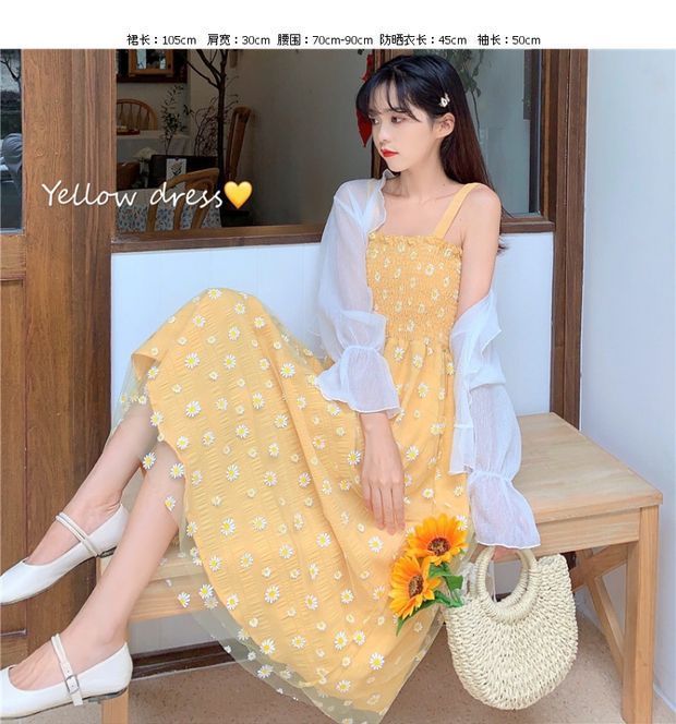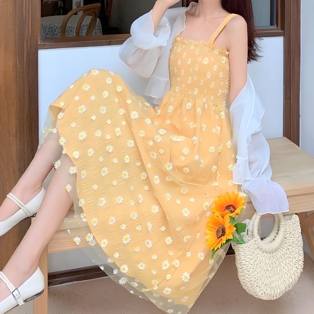Floral Strappy Midi Dress With Mesh Overlay / Sheer Tie Front Cardigan