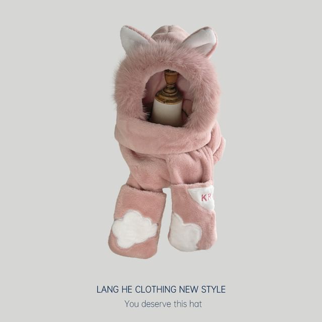 Fox Ear Faux Fur Hooded Scarf with Mitts