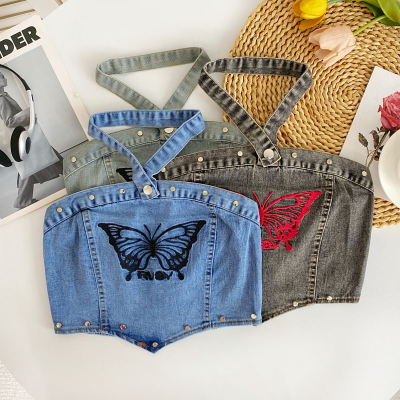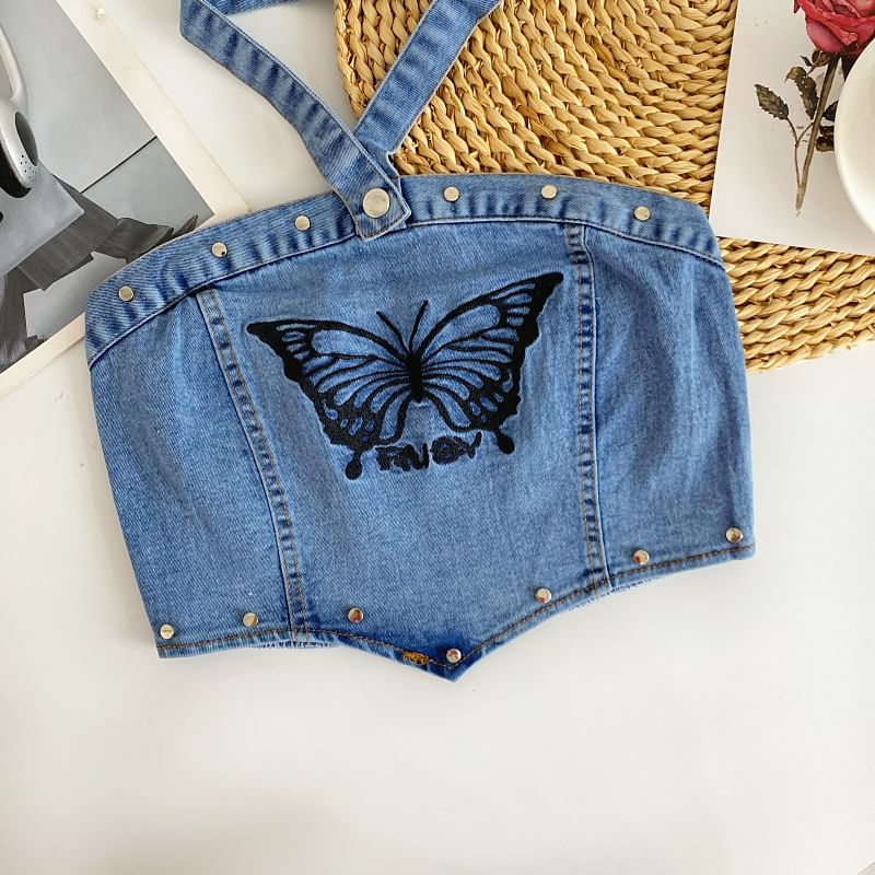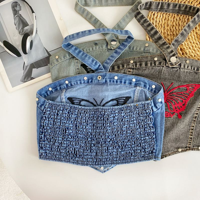 Halter Butterfly Embroidered Washed Panel Crop Denim Top