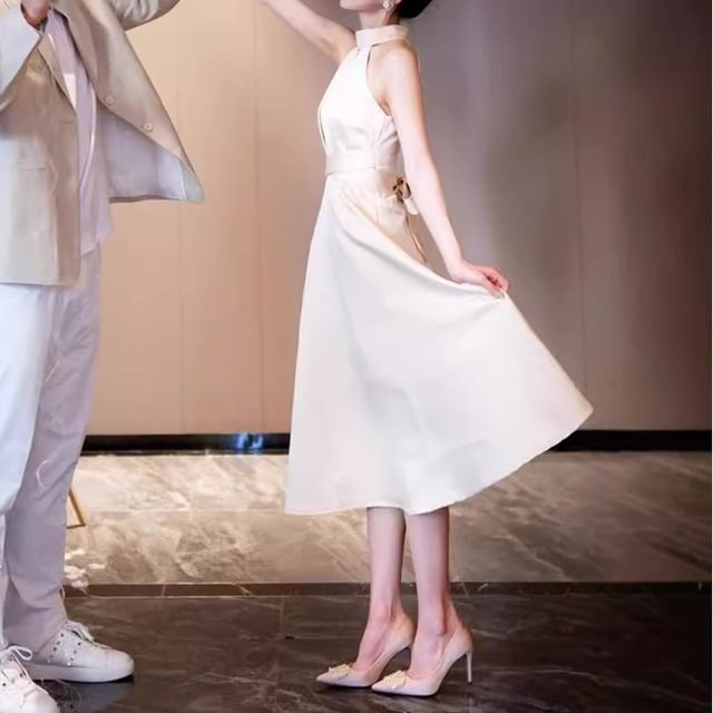Halter Mock Neck Plain Cutout Midi A-Line Cocktail Dress