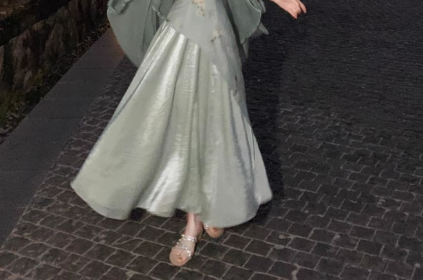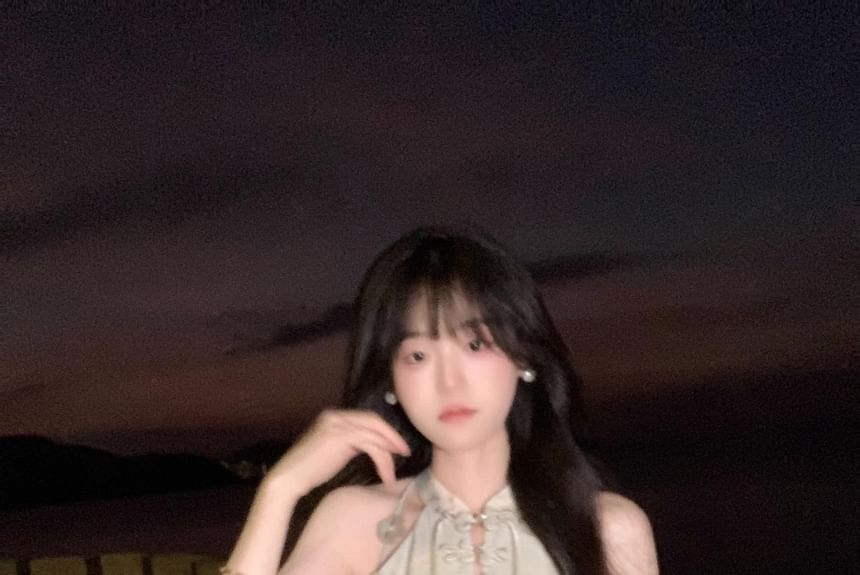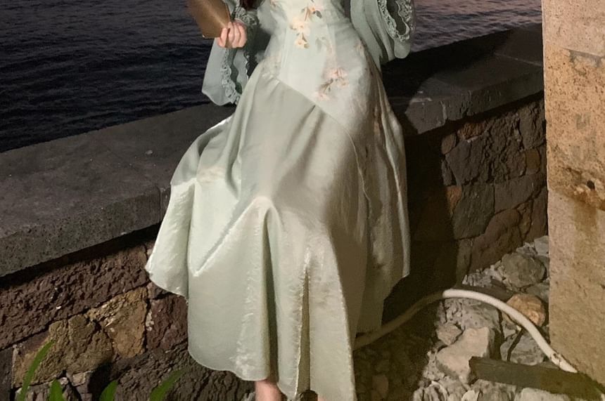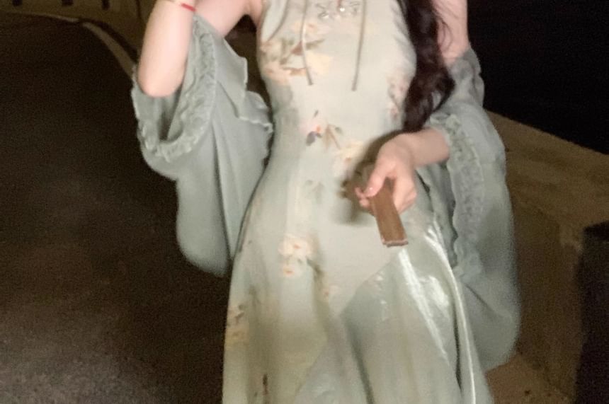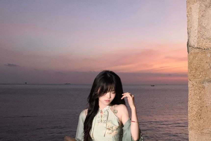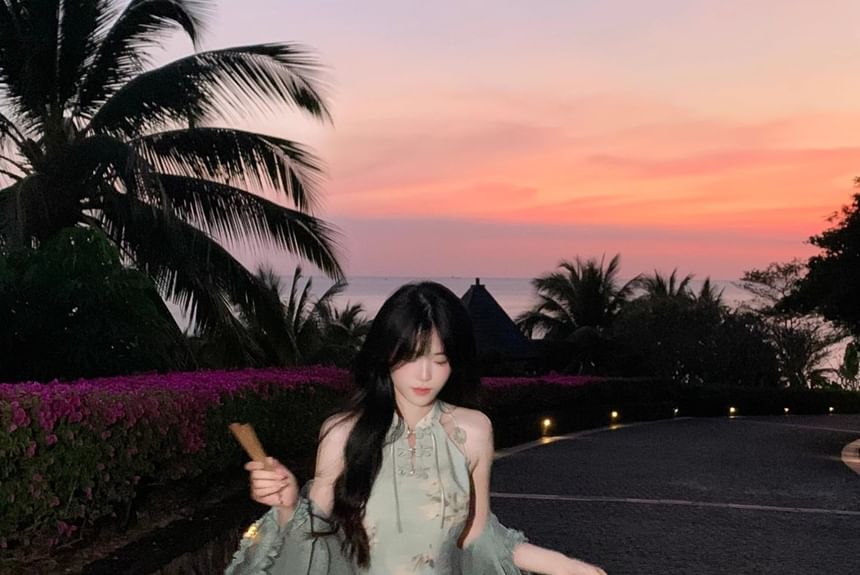 Halter-Neck Floral Print Midi A-Line Dress / Ruffled Jacket