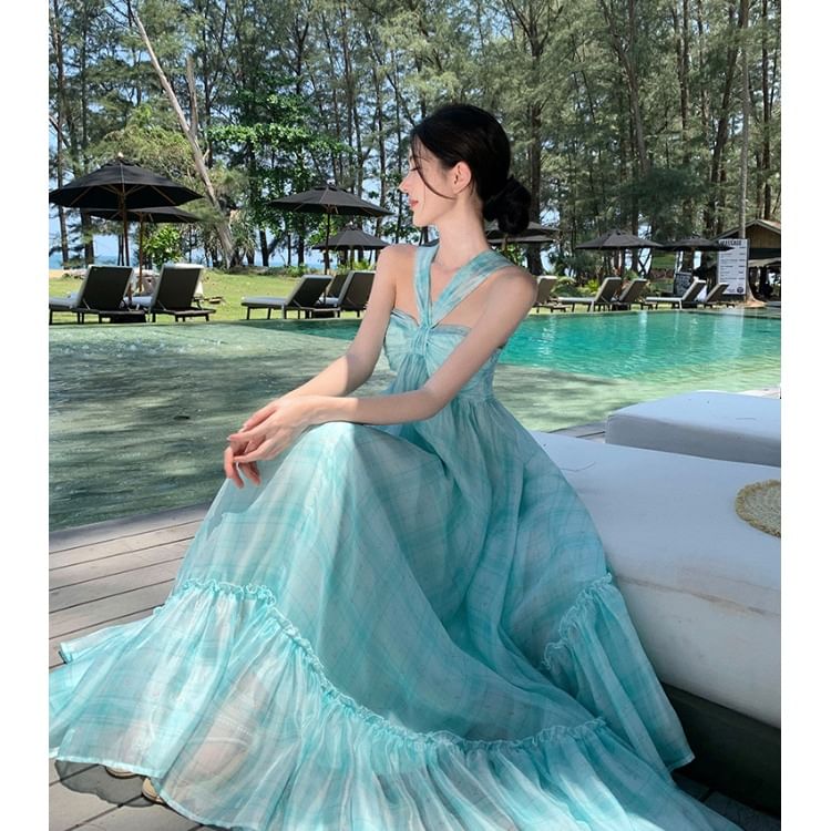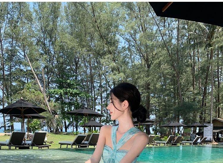Halter-Neck Tie-Dyed Floral Ruffled Midi Sundress