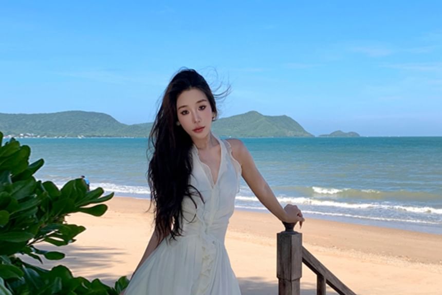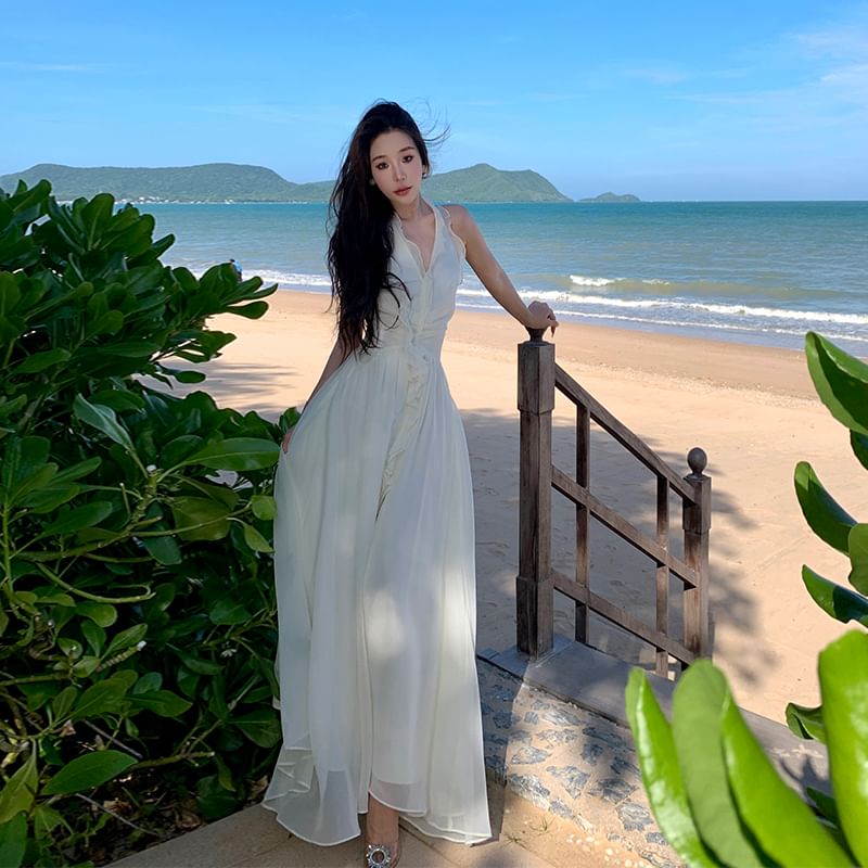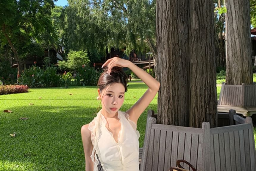 Halter Plain Ruffle Trim Open Back Slit Maxi A-Line Dress