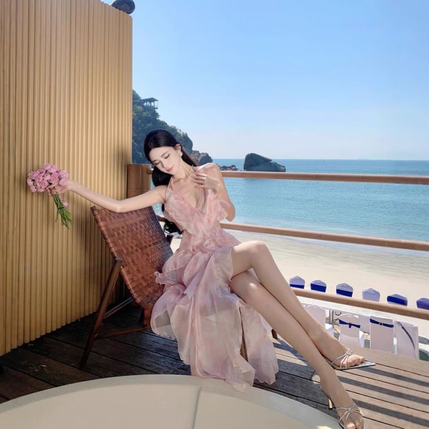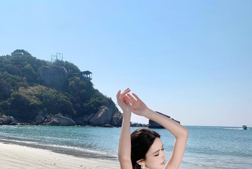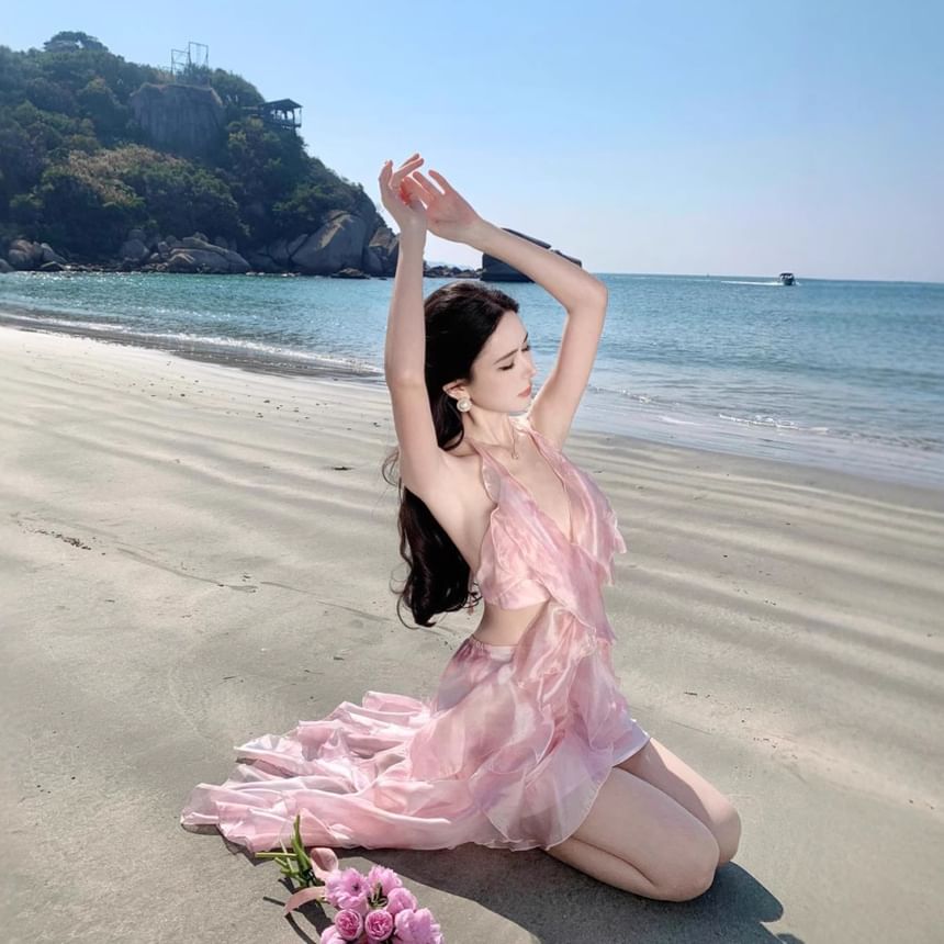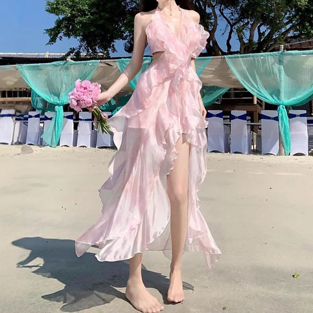 Halter Top + Set: Floral High Midi V-Neck Crop Skirt A-Line Waist