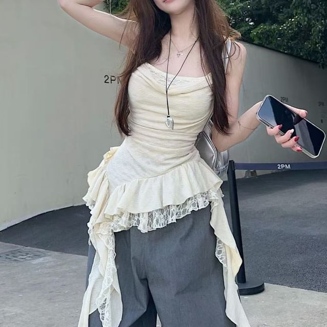 Cowl Neck Asymmetrical Lace Panel Ruffle Hem Camisole Top