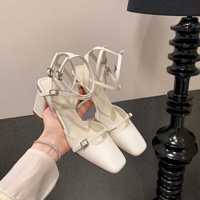 High Heel Faux Chunky Plain Sandals Square Top Leather Toe Buckled