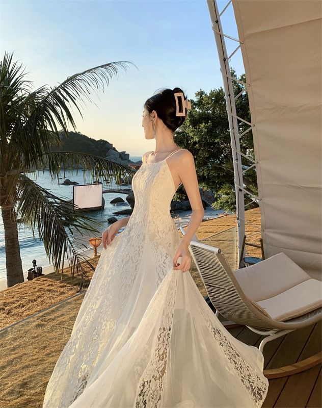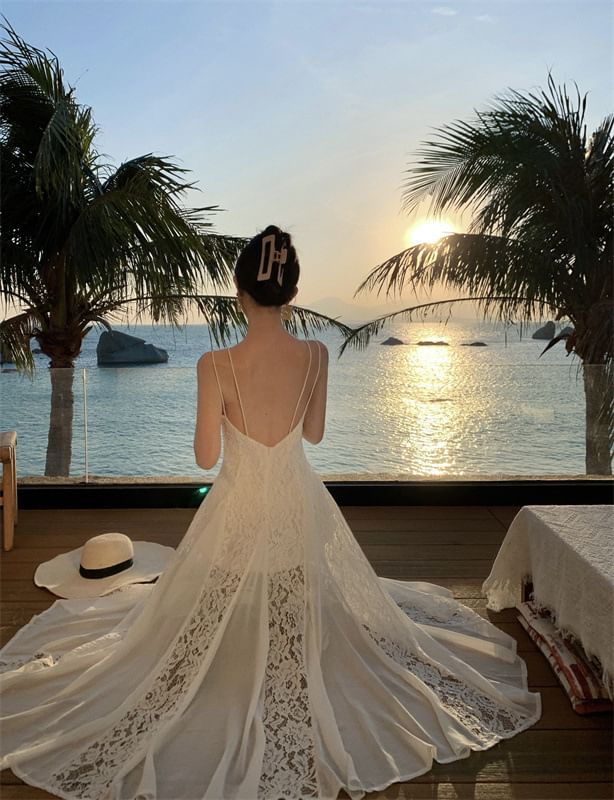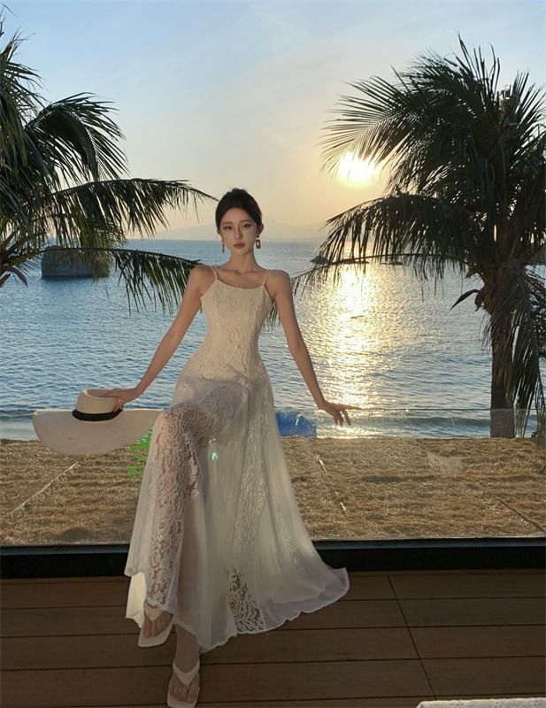 Lace Open Sundress Maxi Strap Spaghetti Back Panel Plain