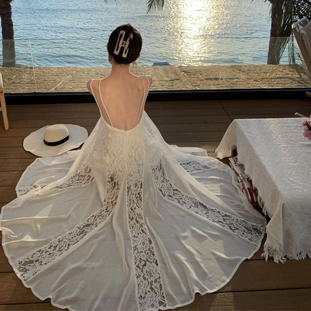 Spaghetti Strap Plain Lace Panel Open Back Maxi Sundress