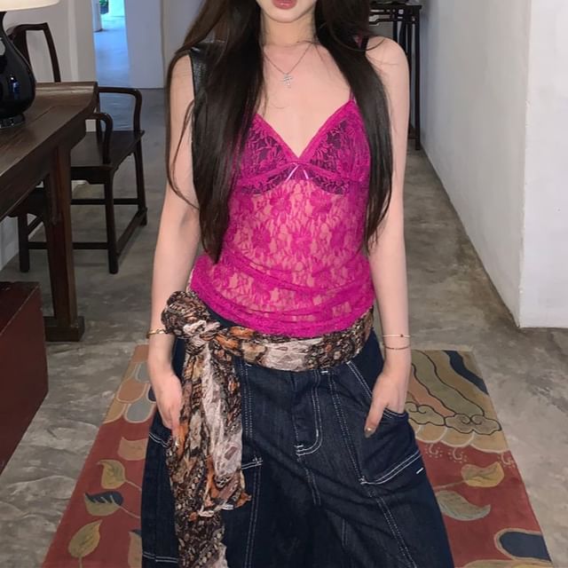 Lace V-Neck Top Camisole Bow Plain