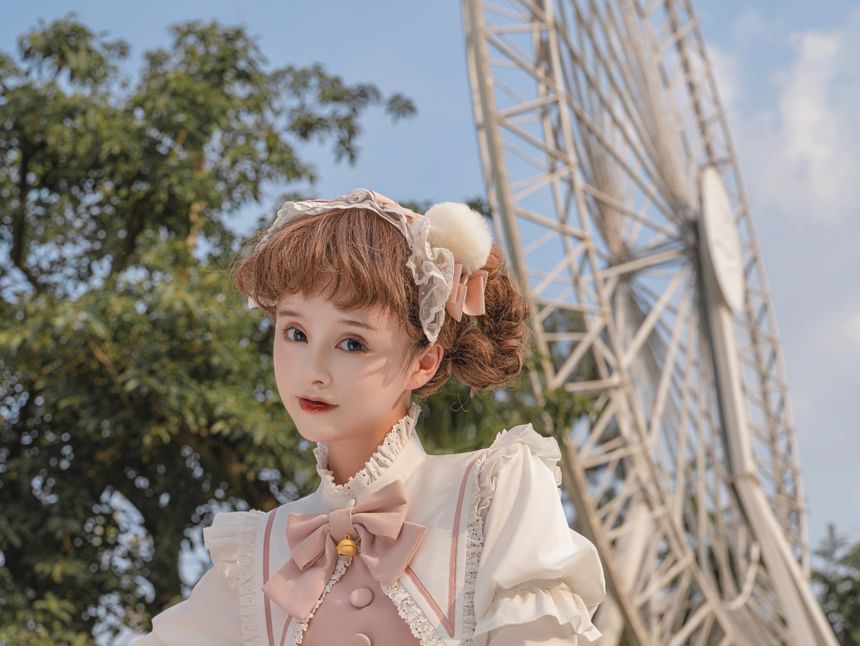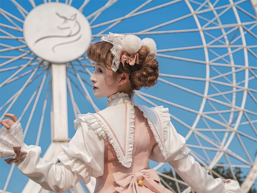 Lolita Long-Sleeve Collared Bow Lace Trim Mini A-Line Dress / Crinoline / Set