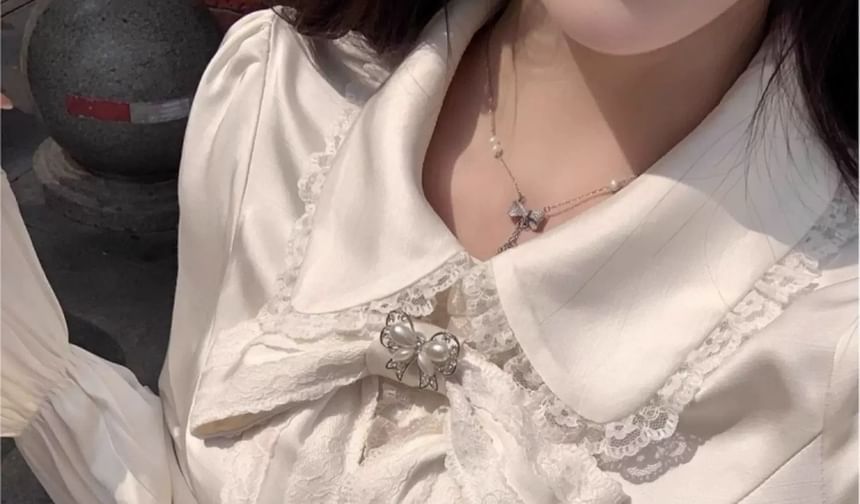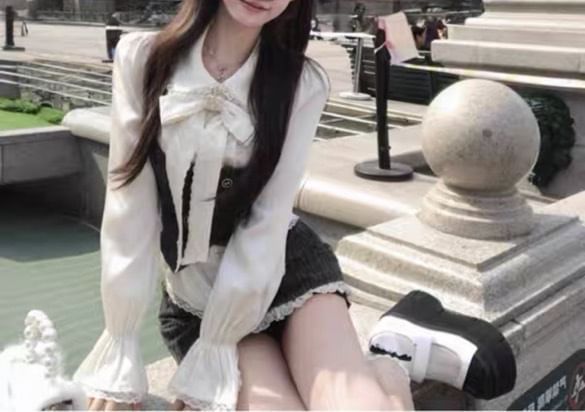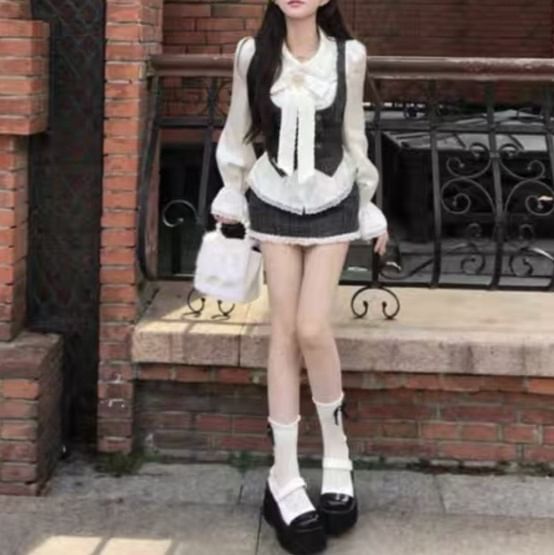 Long Sleeve Collared Plain Bow Ruffle Panel Lace Blouse / V-Neck Plaid Button Vest / High Waist Lace Trim Mini A-Line Skirt / Set