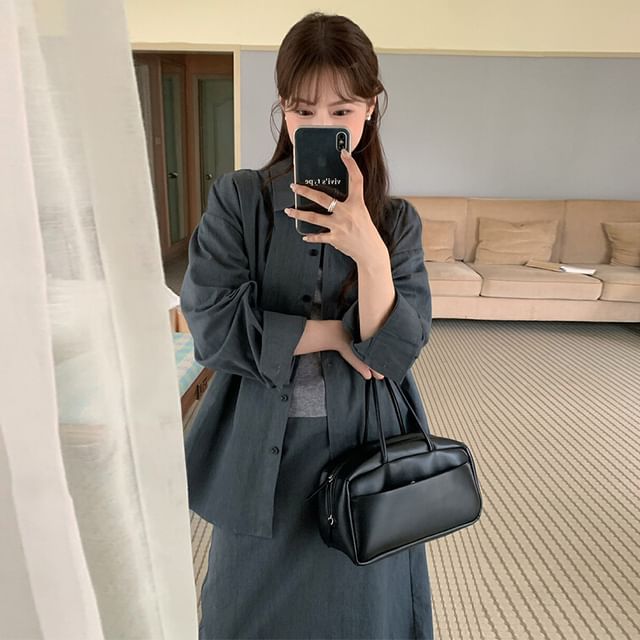 Long Sleeve Collared Plain Shirt / High Waist Maxi A-Line Skirt