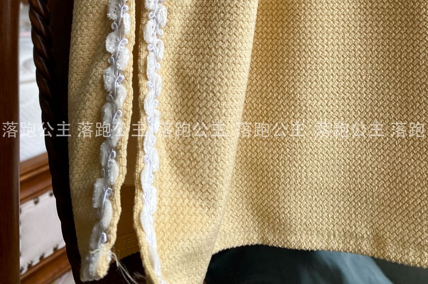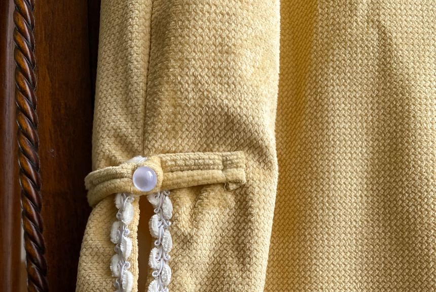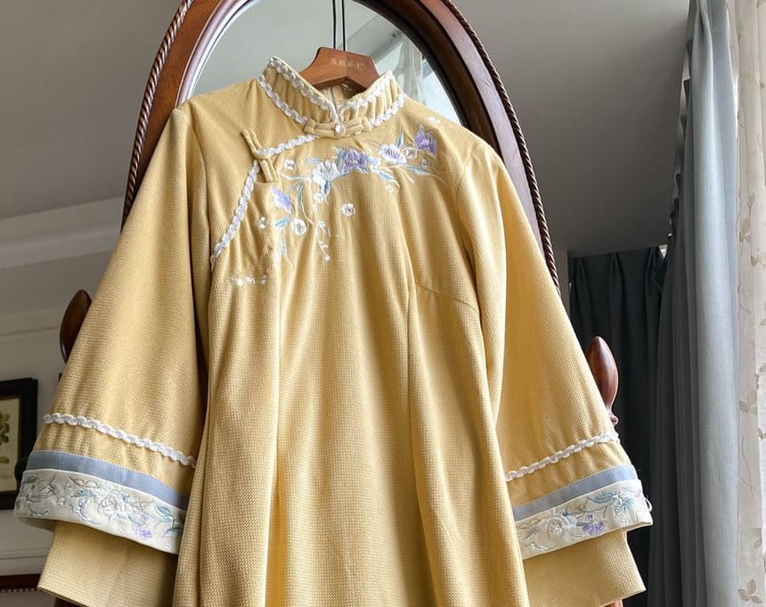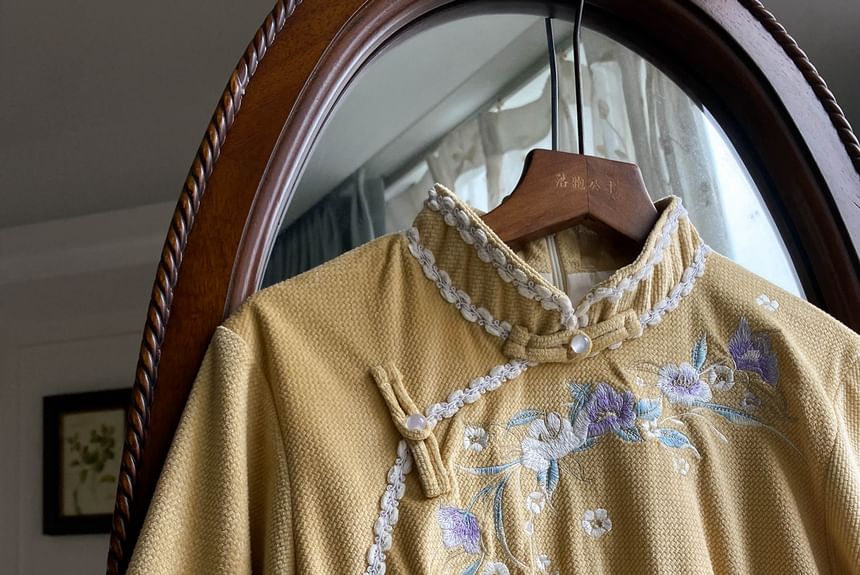 Long-Sleeve Floral Embroidered Panel Midi A-Line Qipao / Round Neck Frog Closure Vest / Set
