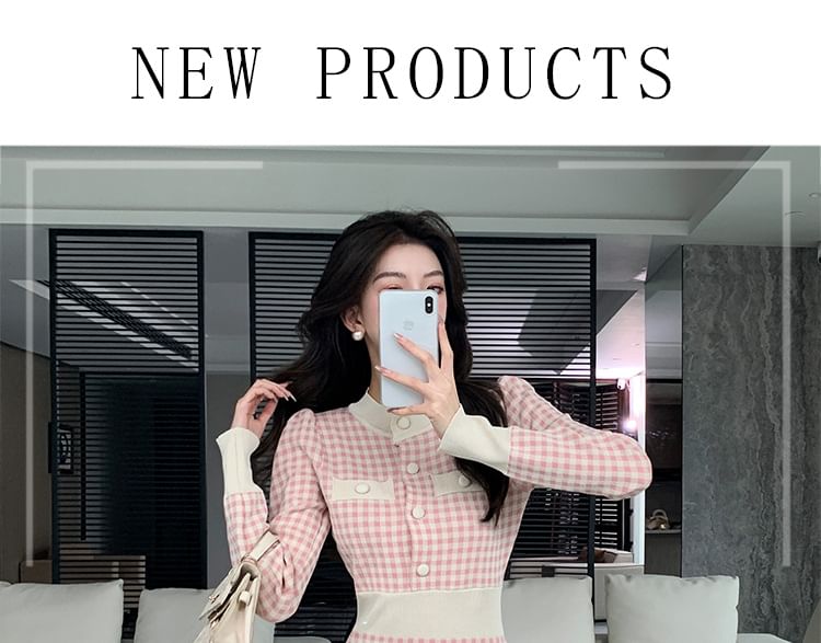 Long-Sleeve Henley Plaid Midi Sheath Dress