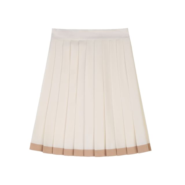 Long-Sleeve Mandarin Collar Floral Embroidered Slit Mini A-Line Dress / High Waist Contrast Trim Pleated Mini A-Line Skirt / V-Neck Bow Fluffy Trim Crop Vest / Set