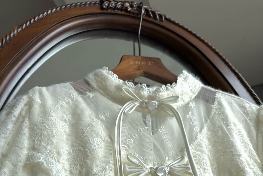 Long-Sleeve Mock Neck Plain Lace Panel Midi A-Line Dress