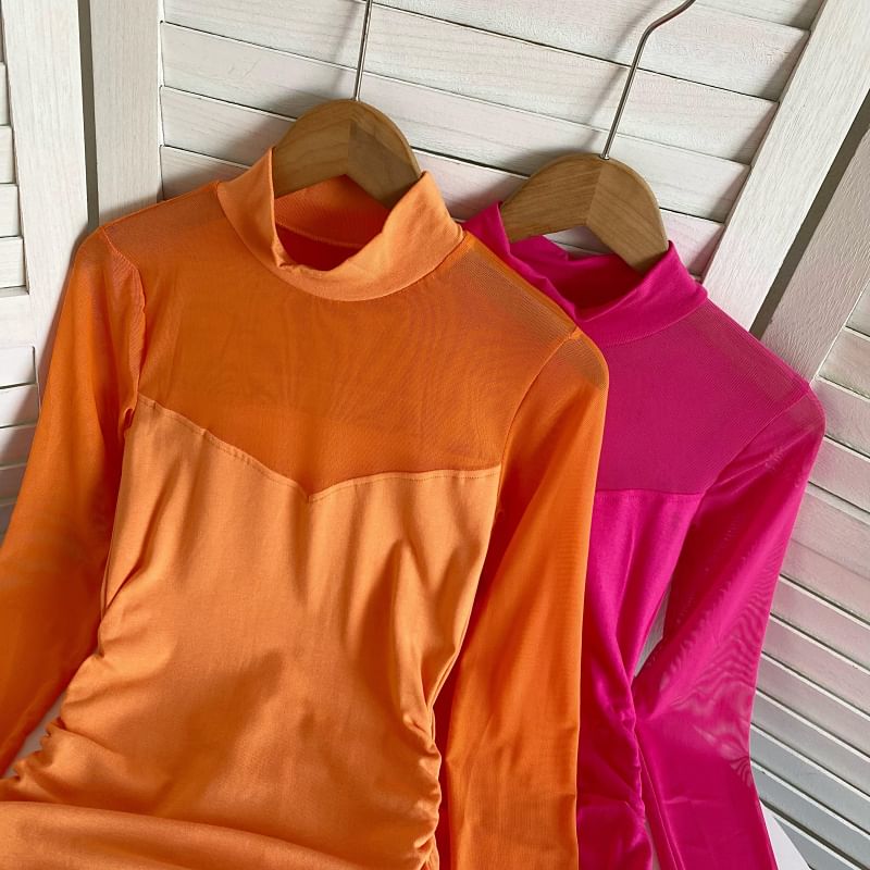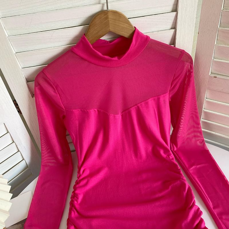 Long-Sleeve Mock Neck Plain Ruched Mesh Panel Mini Sheath Dress