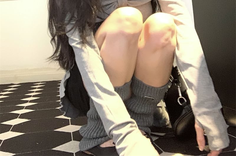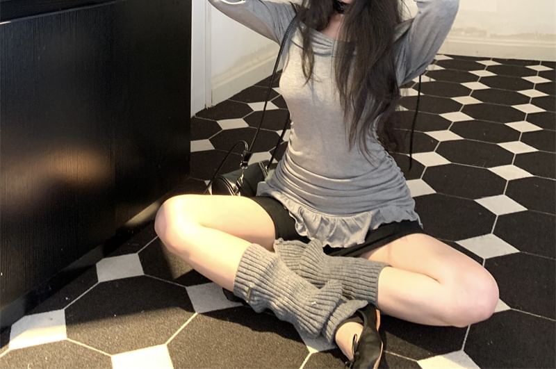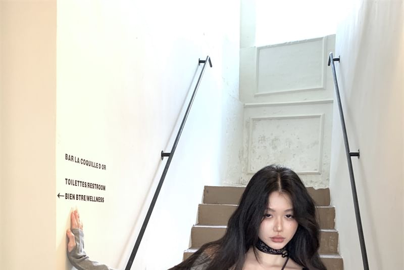 Long Sleeve Off Shoulder Plain Bow Ruffle Top / Spaghetti Strap Plain Panel Lace Mini Sheath Dress