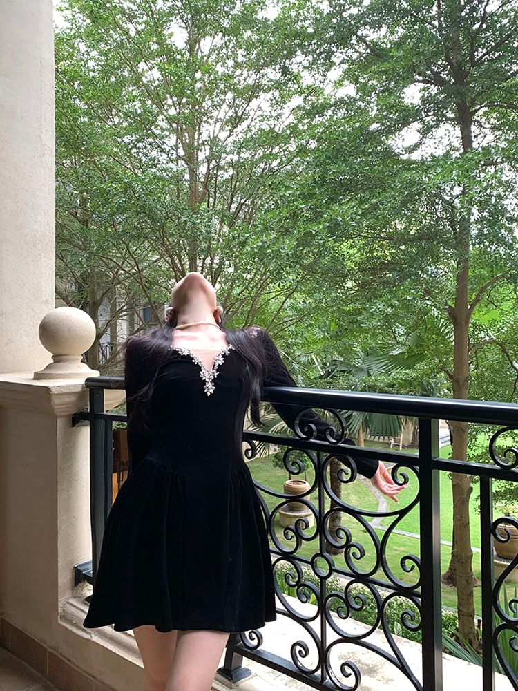 Long-Sleeve Off Shoulder Plain Rhinestone Velvet Mini A-Line Cocktail Dress