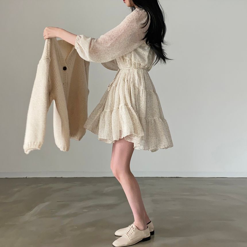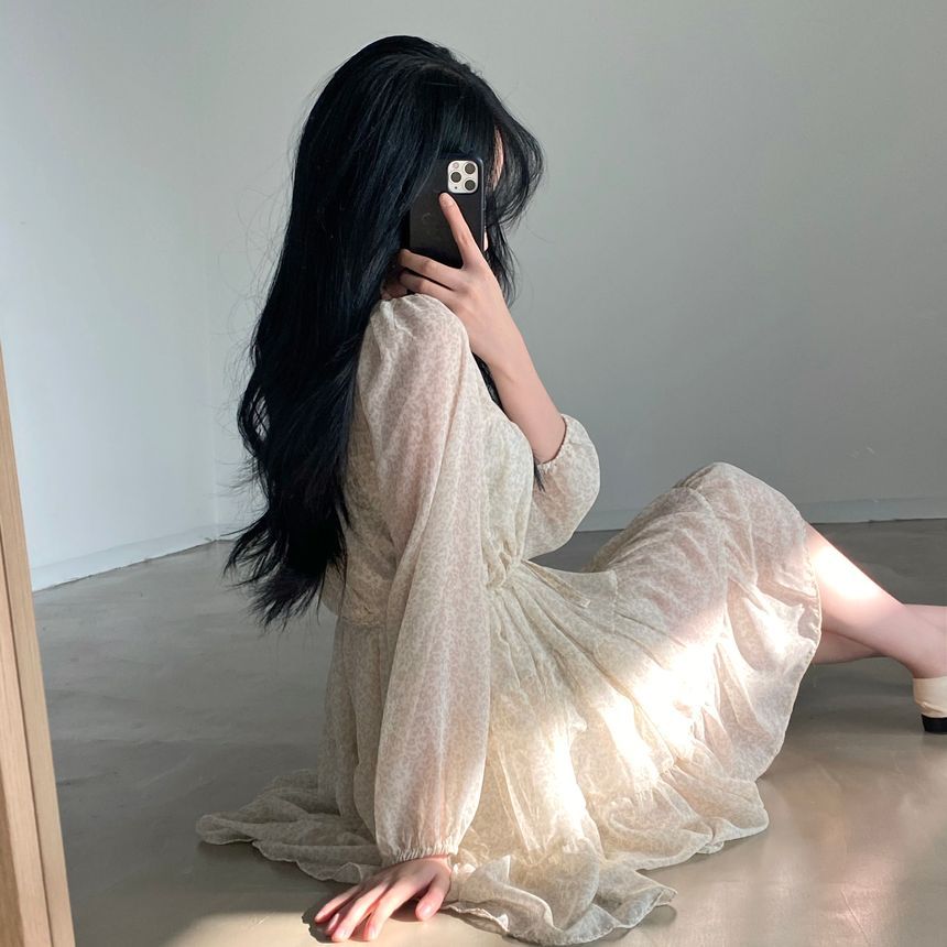 Long-Sleeve Round Neck Print Tiered Mini A-Line Dress