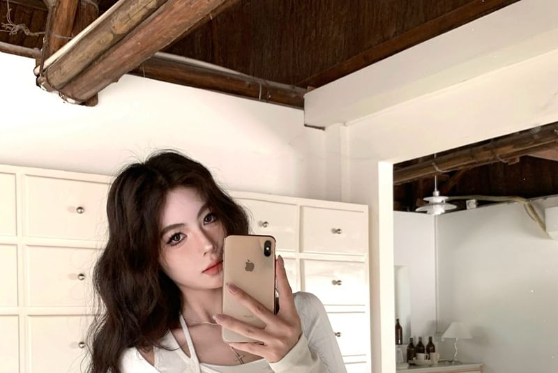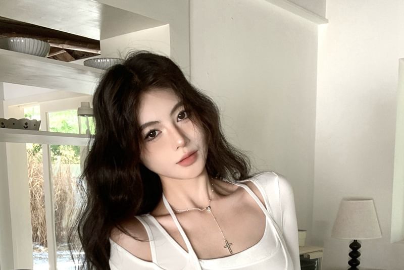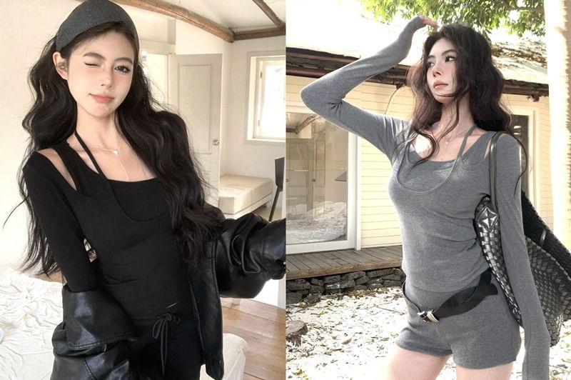 Long-Sleeve Scoop Neck Plain Mock Two-Piece Tee