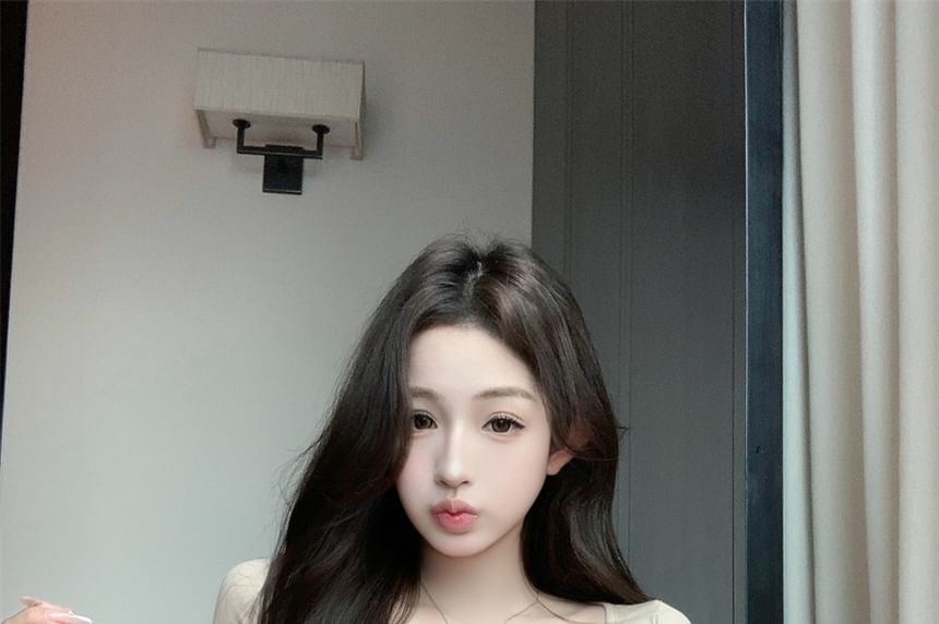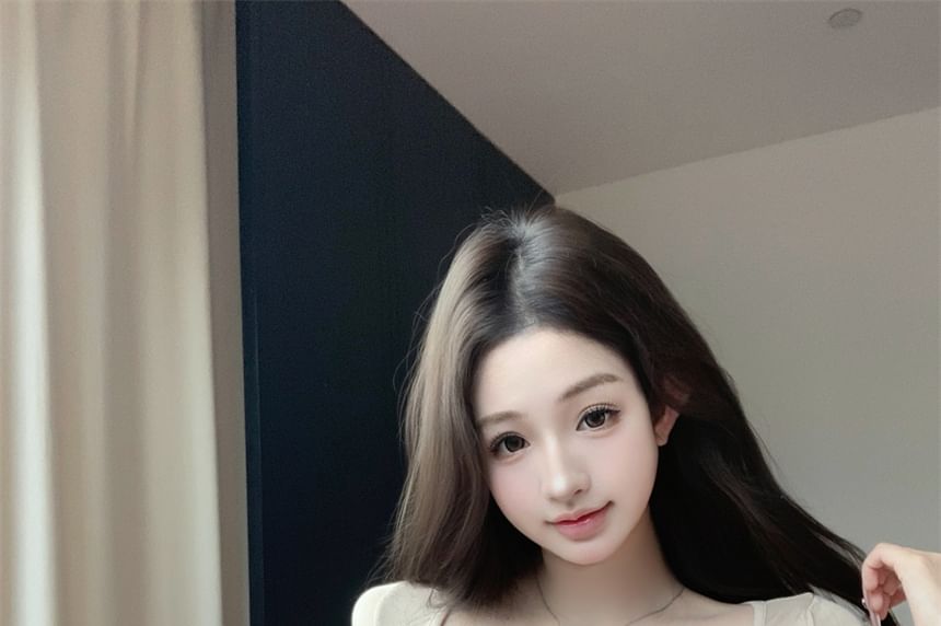 Long-Sleeve Set: Top Lace Crop Plain Fit Henley Camisole + Slim T-Shirt