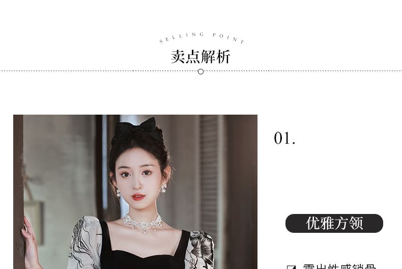 Long-Sleeve Square Neck Floral A-Line Evening Gown